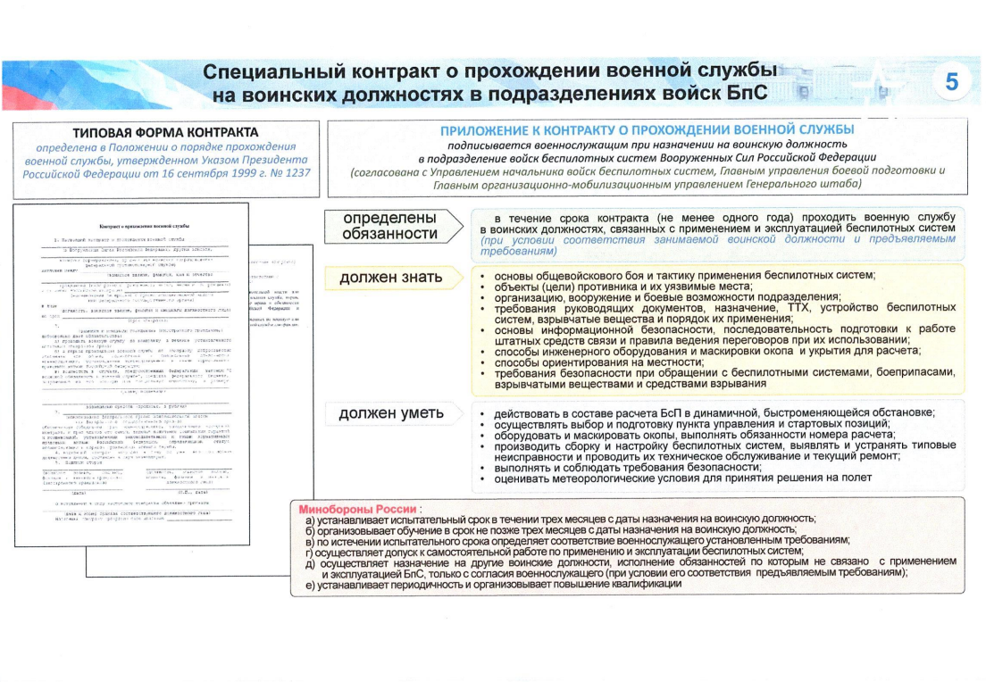 Особые условия прохождения военной службы по контракту в войсках беспилотных систем Вооруженных Сил Российской Федерации. Заключение специального контракта на срок от 1 года, в котором закрепляются дополнительные условия: гарантированное увольнение с военной службы по истечении срока контракта при нежелании заключать новый контракт; прохождение военной службы только в войсках беспилотных систем. Отобранных военнослужащих, соответствующих предъявляемым требованиям и согласных к назначению на воинские должности в подразделения беспилотной авиации, запрещается направлять на иные должности в другие подразделения; обязательное обучение по программе специальной подготовки специалистов беспилотных систем в учебной сети Министерства обороны Российской Федерации в течение двух месяцев.