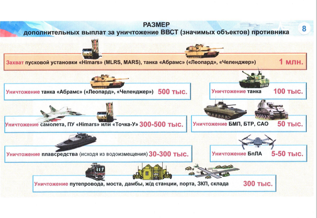 Меры по стимулированию граждан к поступлению на военную службу по контракту в войска беспилотных систем Вооруженных Сил Российской Федерации. Социально-экономическими мерами, обеспечивающими мотивацию граждан к поступлению на военную службу по контракту, являются: обеспечение в соответствии с Указом Президента Российской Федерации от 31 июля 2024 г. № 644 за заключение контракта о прохождении военной службы на срок более одного года для выполнения задач специальной военной операции: федеральной единовременной денежной выплатой в размере 400 тыс. рублей; региональной единовременной денежной выплатой не ниже 400 тыс. рублей (размер устанавливается правительством субъекта Российской Федерации); предоставление выплаты за уничтожение вооружения и военной техники противника в размере от 5 тыс. руб. до 500 тыс. руб. в зависимости от образца вооружения; установление специалистам БпС ежемесячной надбавки за особые условия военной службы к окладу по воинской должности в размере 300 %; награждение государственными наградами и ведомственными знаками отличия; предоставление академического отпуска студентам гражданских образовательных организаций высшего и среднего профессионального образования, заключившим контракт о прохождении военной службы в войсках БпС; поступление в образовательные организации высшего образования вне конкурса на бюджетной основе для получения различных уровней образования (бакалавриат, магистратура и аспирантура); сохранение рабочих мест до окончания военной службы по контракту.